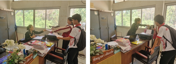 ภาพปฏิบัติหน้าที่ครูเวรรับนักเรียนที่หน้าประตูโรงเรียนทุกวันพุธ
